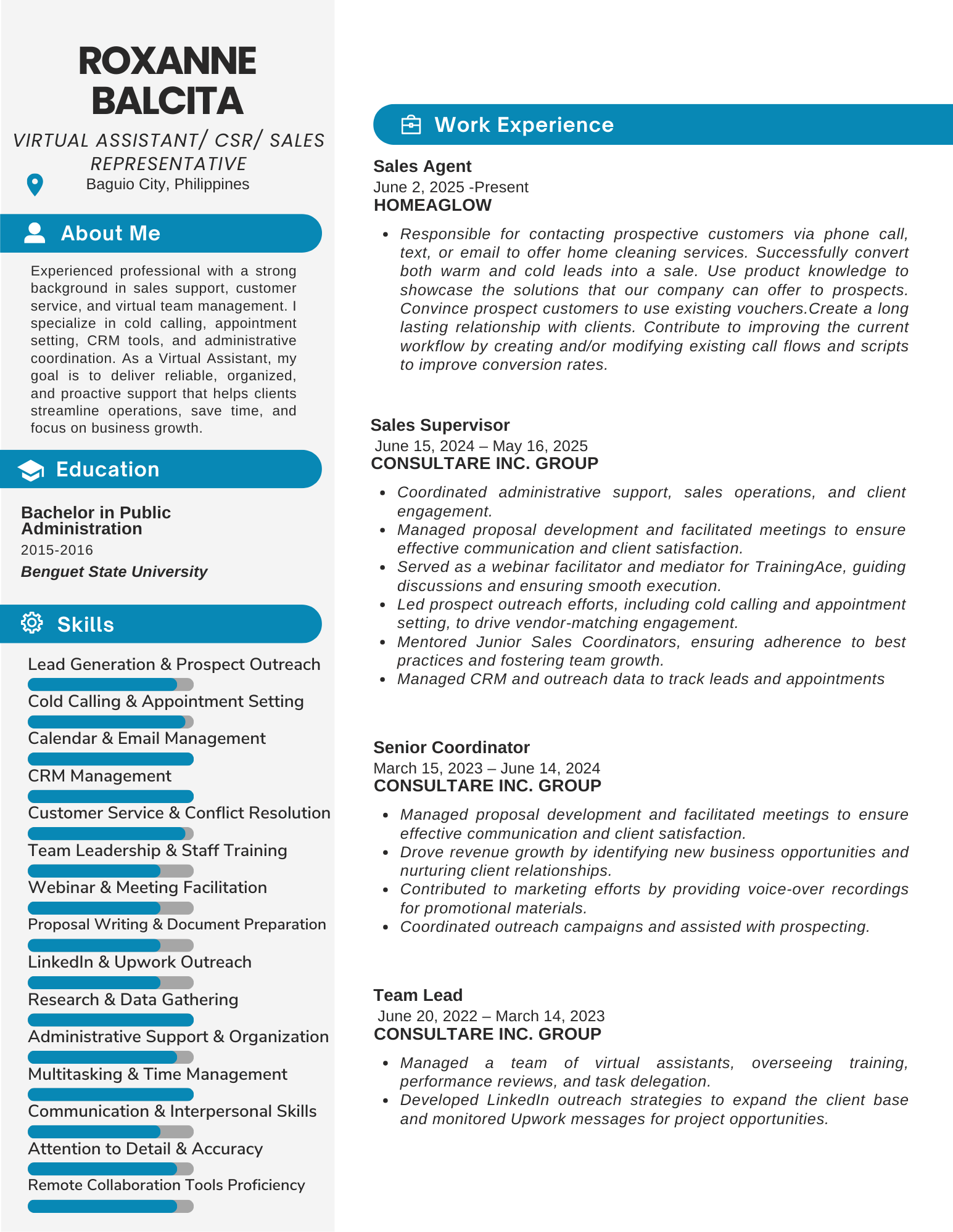Experienced professional with a strong background in sales support, customer service, and virtual team management. I specialize in sales, customer service, cold calling, appointment setting, CRM tools, and administrative coordination. As a Virtual Assistant, my goal is to deliver reliable, organized, and proactive support that helps clients streamline operations, save time, and focus on business growth.